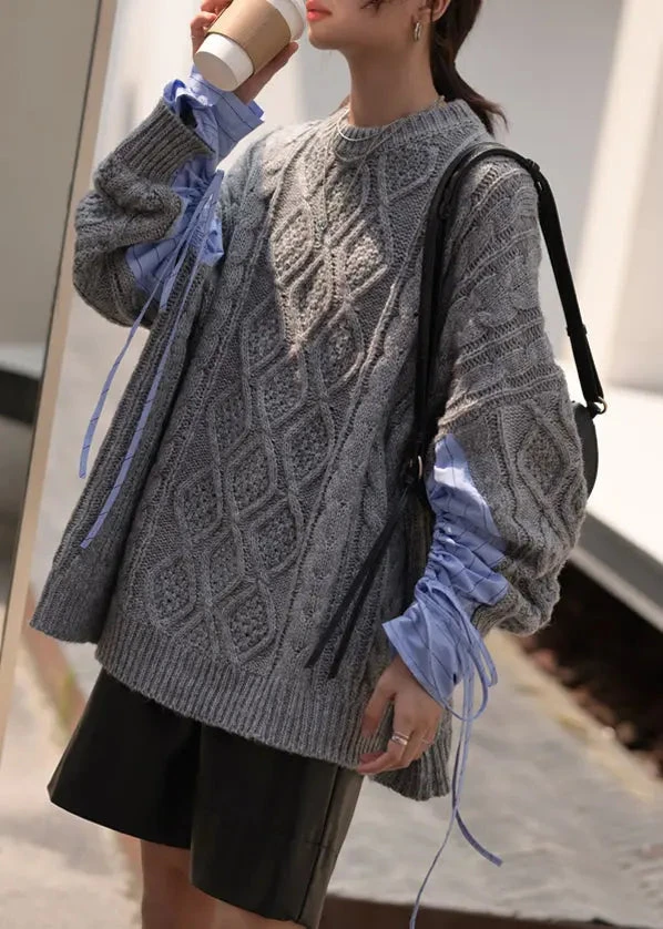 Plus Size Black O Neck Drawstring Patchwork Cotton Knit Sweaters Fall