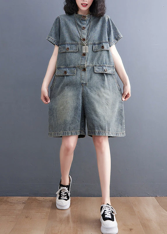 Plus Size Denim Blue O-Neck Patchwork Button Jumpsuits Short Sleeve