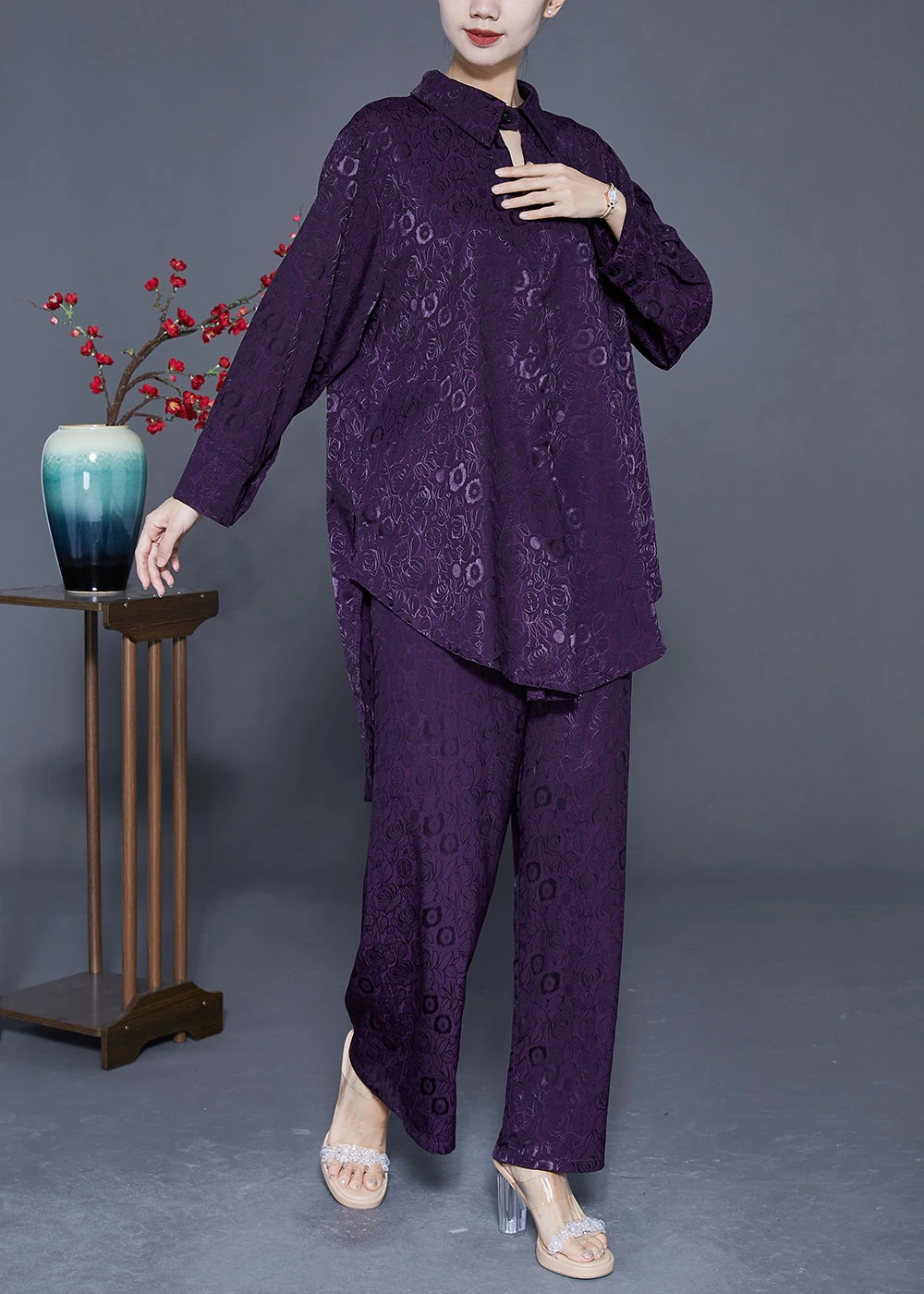 Purple Silk Two Piece Set Peter Pan Collar Low High Design Spring