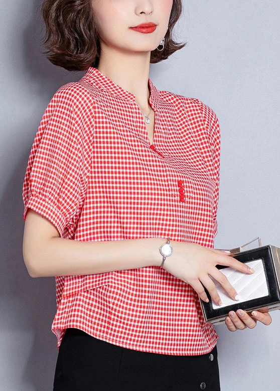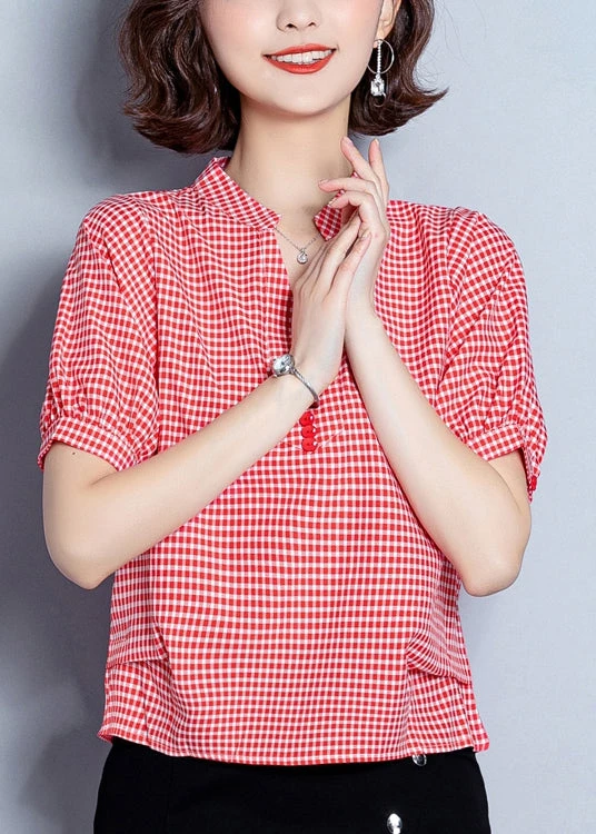 Red Plaid Chiffon Blouses Oversized Wrinkled Short sleeve