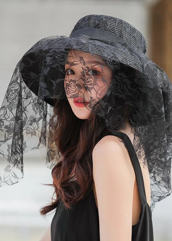 Retro Black Lace Patchwork Straw Woven Floppy Sun Hat LC0471