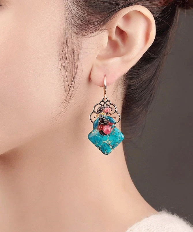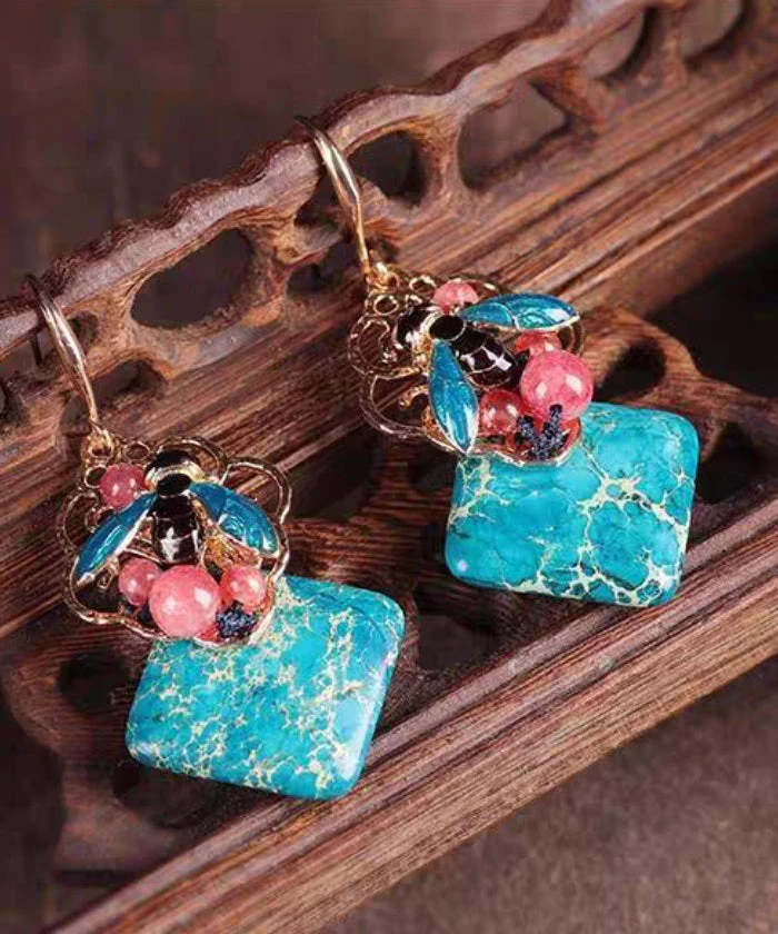 Retro Blue Copper Cloisonne Jade Bee Drop Earrings