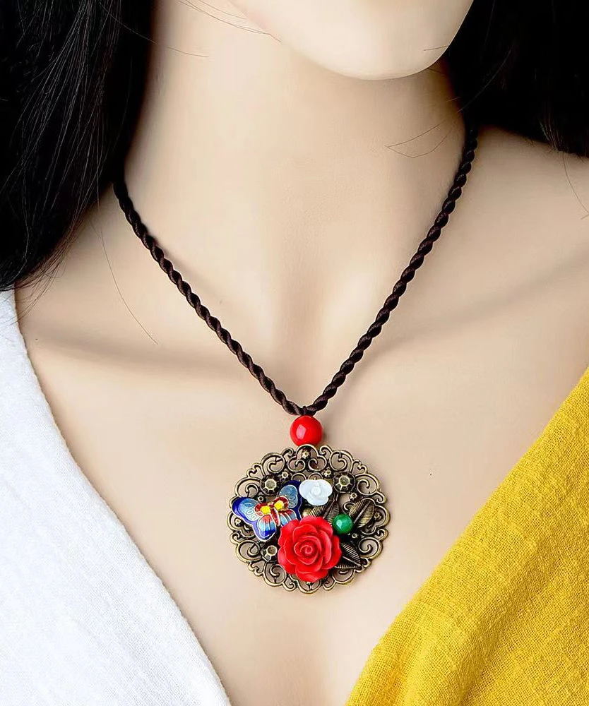 Retro Red Floral Butterfly Hollow Out Metal Pendant Necklace