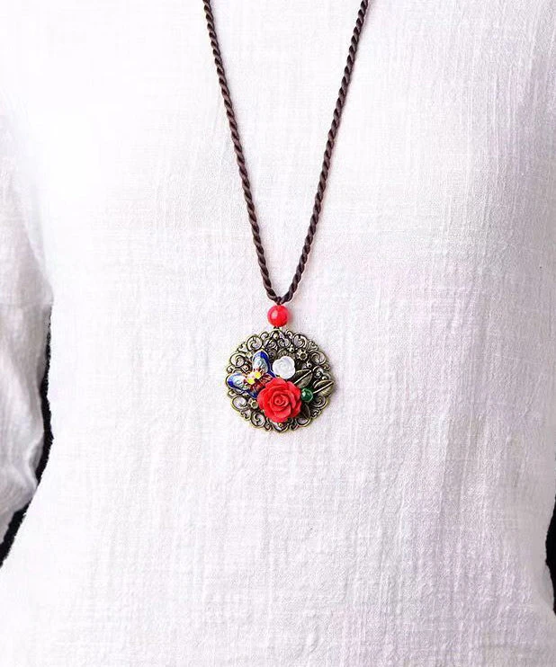 Retro Red Floral Butterfly Hollow Out Metal Pendant Necklace LY9190