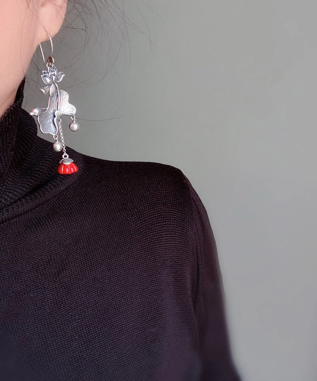 Retro Red Sterling Silver Lotus Tassel Drop Earrings