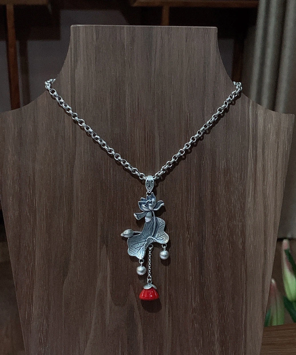 Retro Red Sterling Silver Lotus Tassel Drop Earrings LY2052