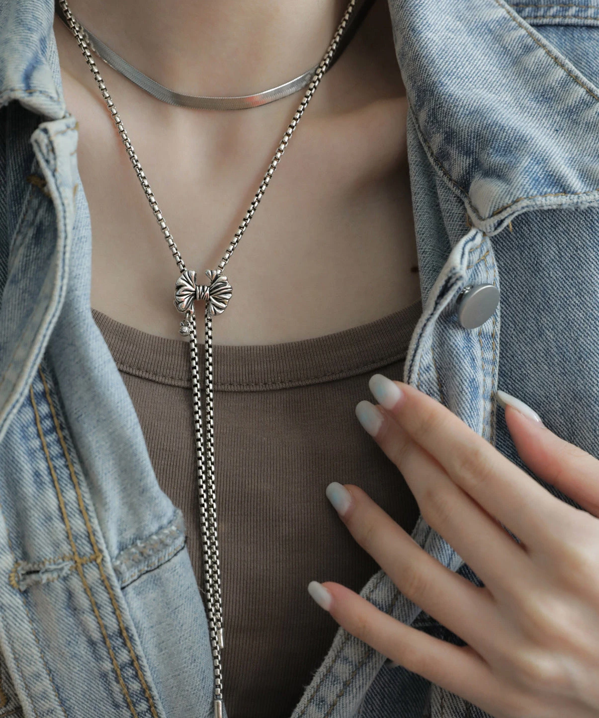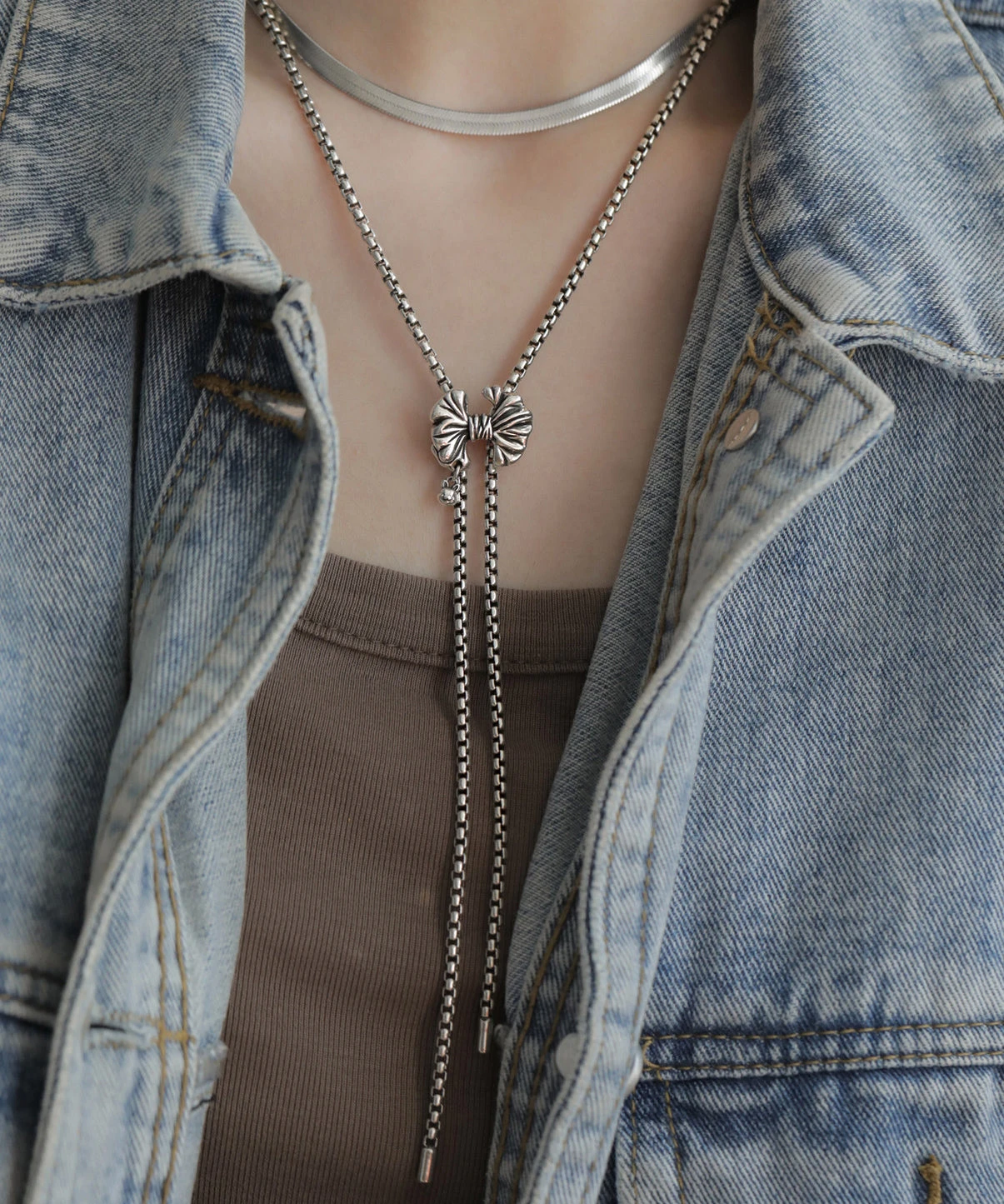 This exquisite pendant necklace boasts a retro silk bow design crafted from sterling silver and adorned with a delicate tassel, adding timeless elegance to any ensemble.