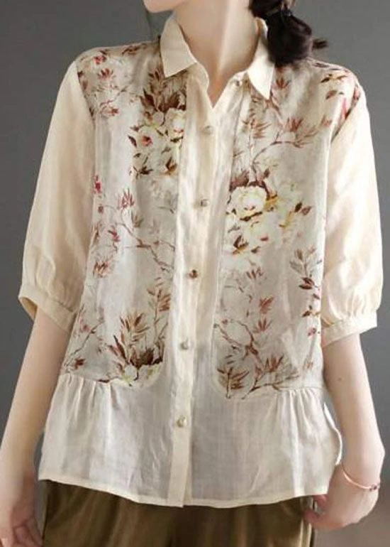 Simple Apricot Peter Pan Collar Print Linen Blouse Top Summer