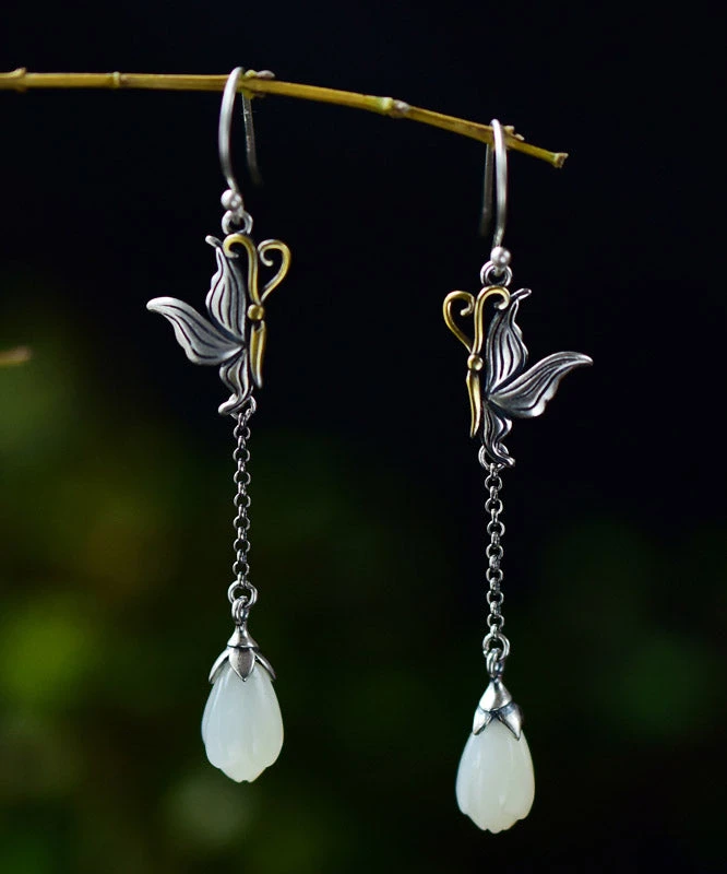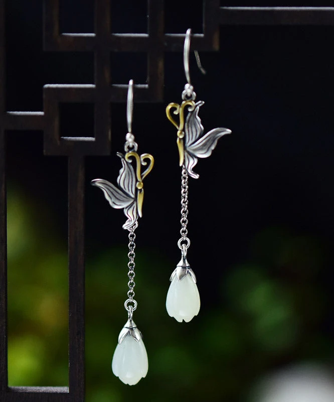 Skinny Light Green Sterling Silver Jade Butterfly Lotus DropEarrings LY2316