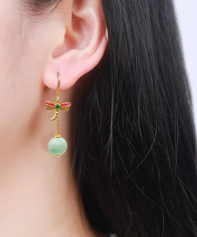 Sterling Silver Overgild Jade Dragonfly Tassel Drop Earrings