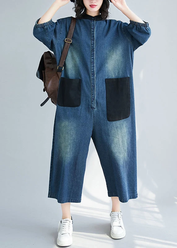 Style Blue Stand Collar Oversized Patchwork Pockets Denim Jumpsuits Summer