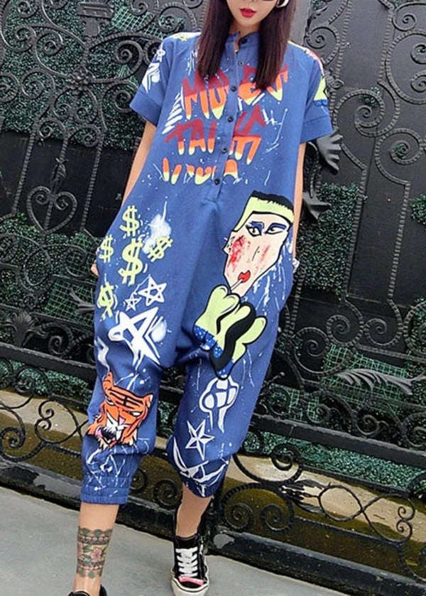 Stylish Blue Stand Collar Print Button Patchwork Cotton Jumpsuits Summer