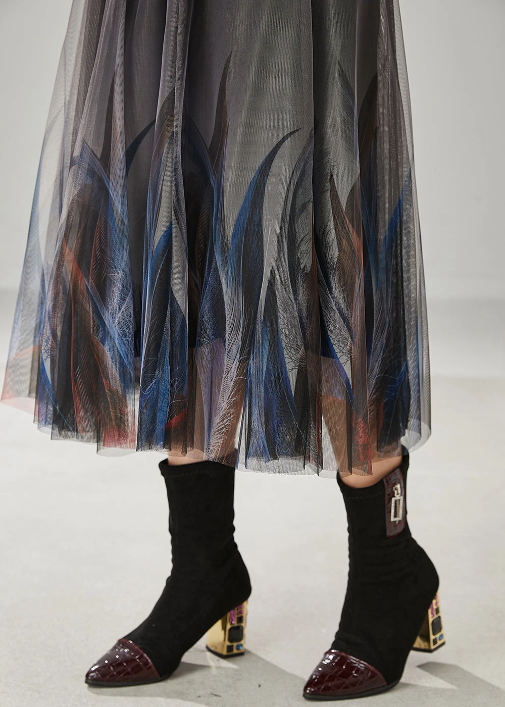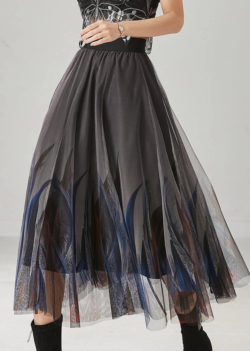 Experience the height of elegance with our Stylish Grey Feather Print Tulle Skirts for Summer, a culmination of art and fashion. Let every step be a graceful dance as you embody exclusivity and refinement in this luxurious piece.