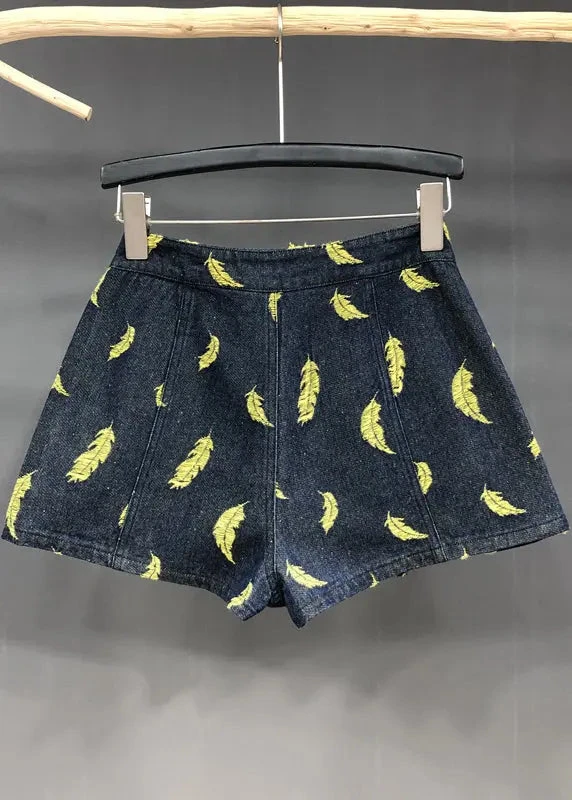 Stylish Navy Feathers Embroideried Patchwork Denim Shorts Summer