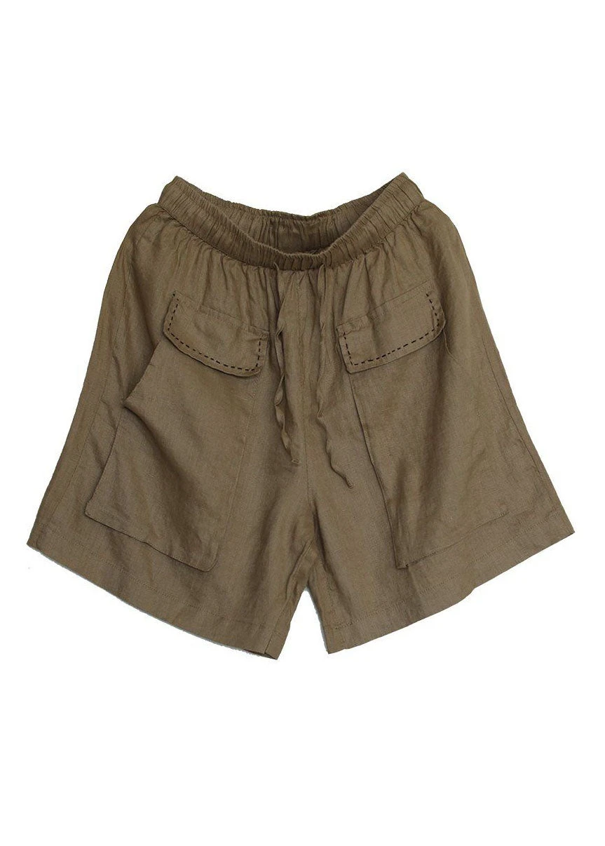 Unique Khaki Pockets Patchwork Linen Shorts Summer