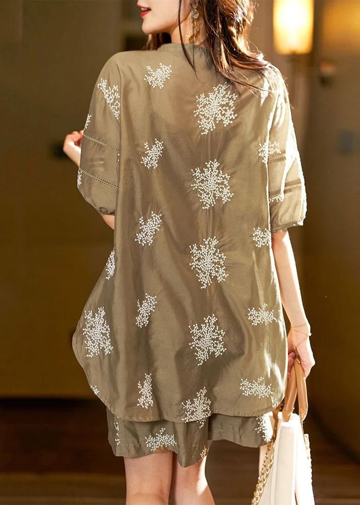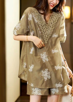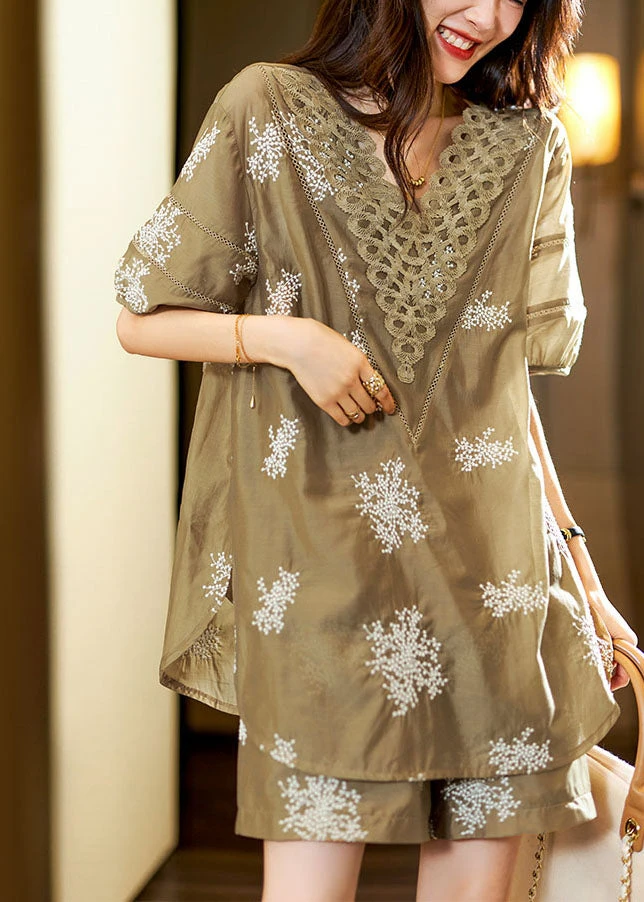 Unique Khaki V Neck Embroideried Chiffon Top And Shorts Two Pieces Set Summer