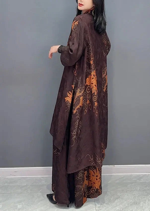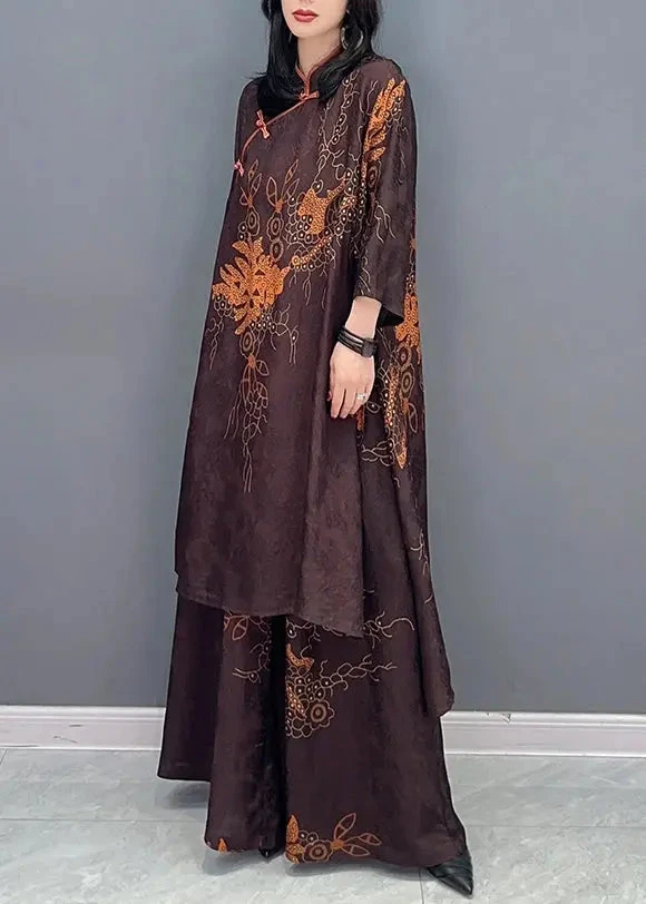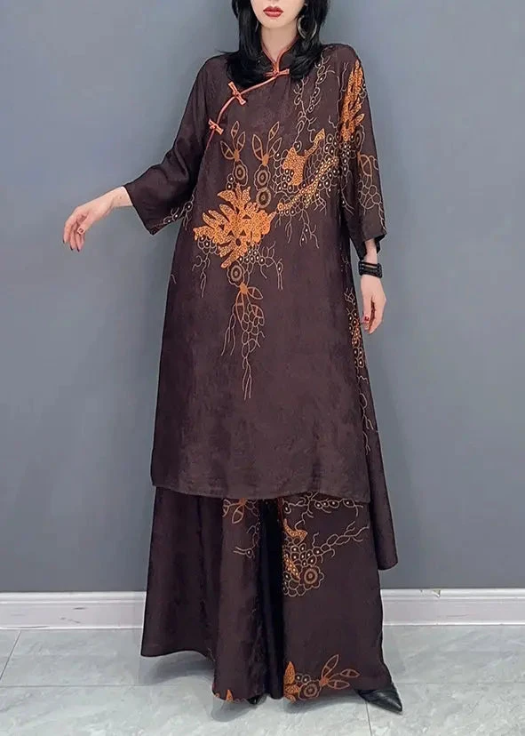 Vintage Brown Stand Collar Print Patchwork Silk Two Piece Set Outfits Fall ML3182