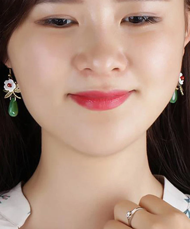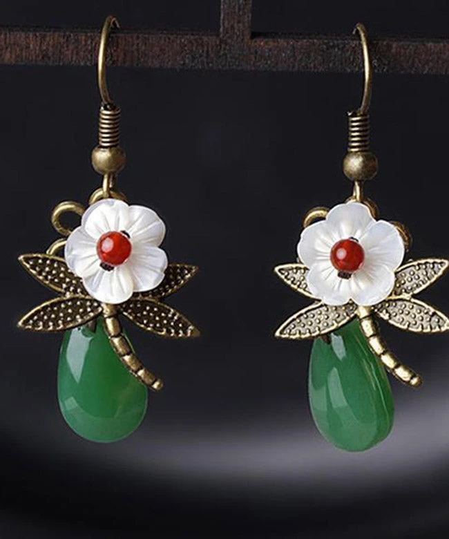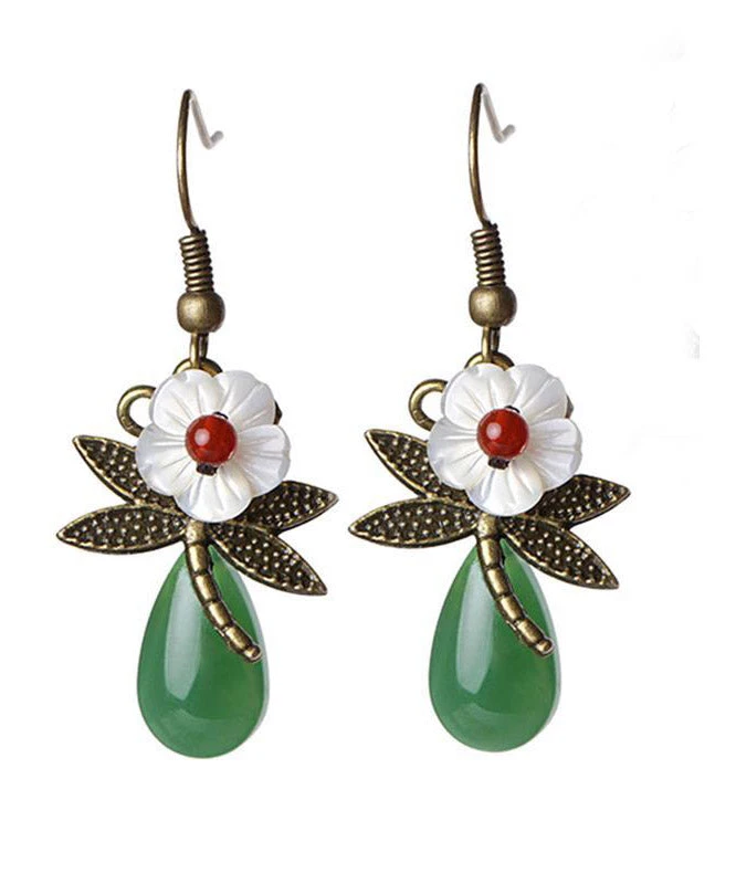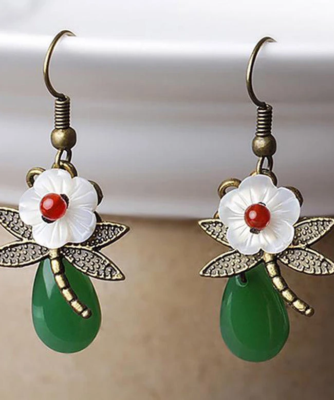 Vintage Green Sterling Silver Agate Shell Flower Cloured Glaze Dragonfly Drop Earrings LY2313