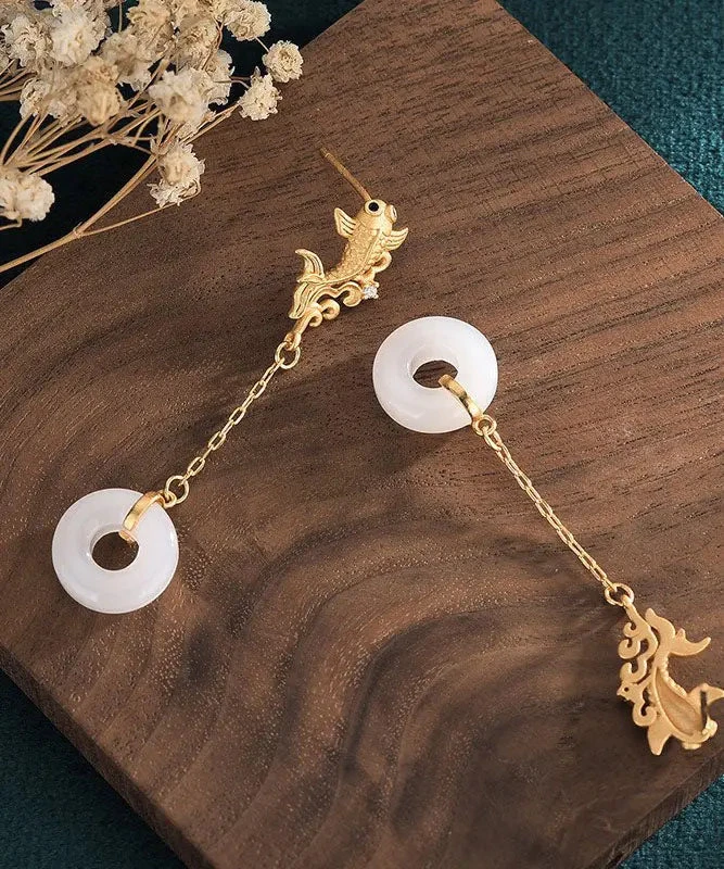 Vintage White Sterling Silver Overgild Jade Goldfish Drop Earrings LY8963
