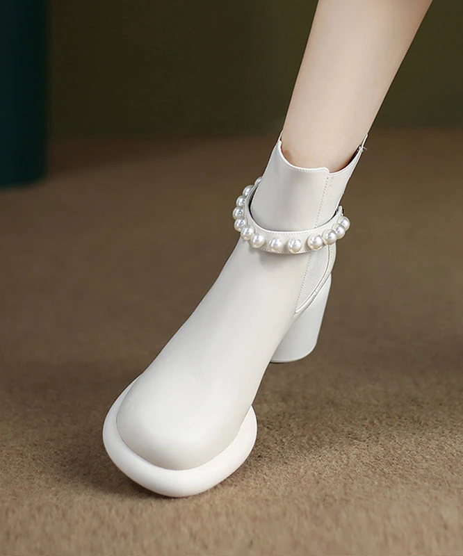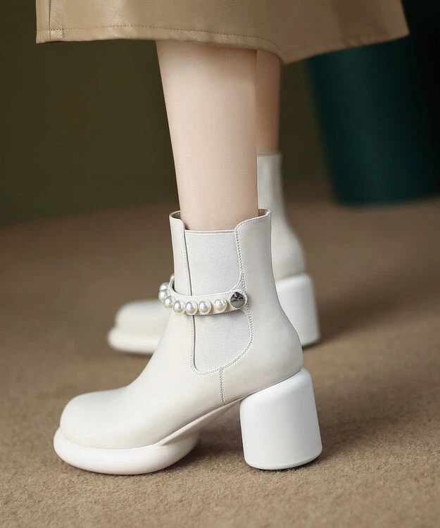 White Boots Chunky Cowhide Leather Handmade Splicing Nail Bead