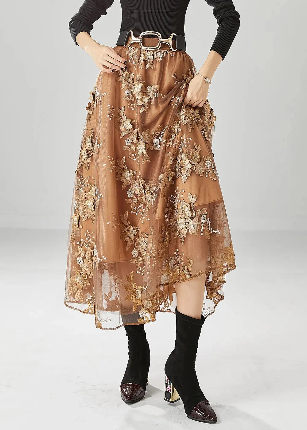 Women Brown Elastic Waist Embroideried Tulle Skirts Fall ML0470