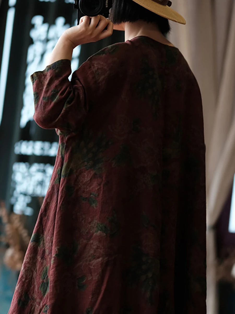 Indulge in the luxury of the Women Ethnic Flower Worn Loose Long Sleeve Linen Dress, boasting a graceful V-neck collar and Reglan sleeves. Cascading down to ankle-length, both the sleeves and the dress are crafted from soft, airy linen and adorned with an exquisite floral print, making it the ideal choice for the balmy summer months.