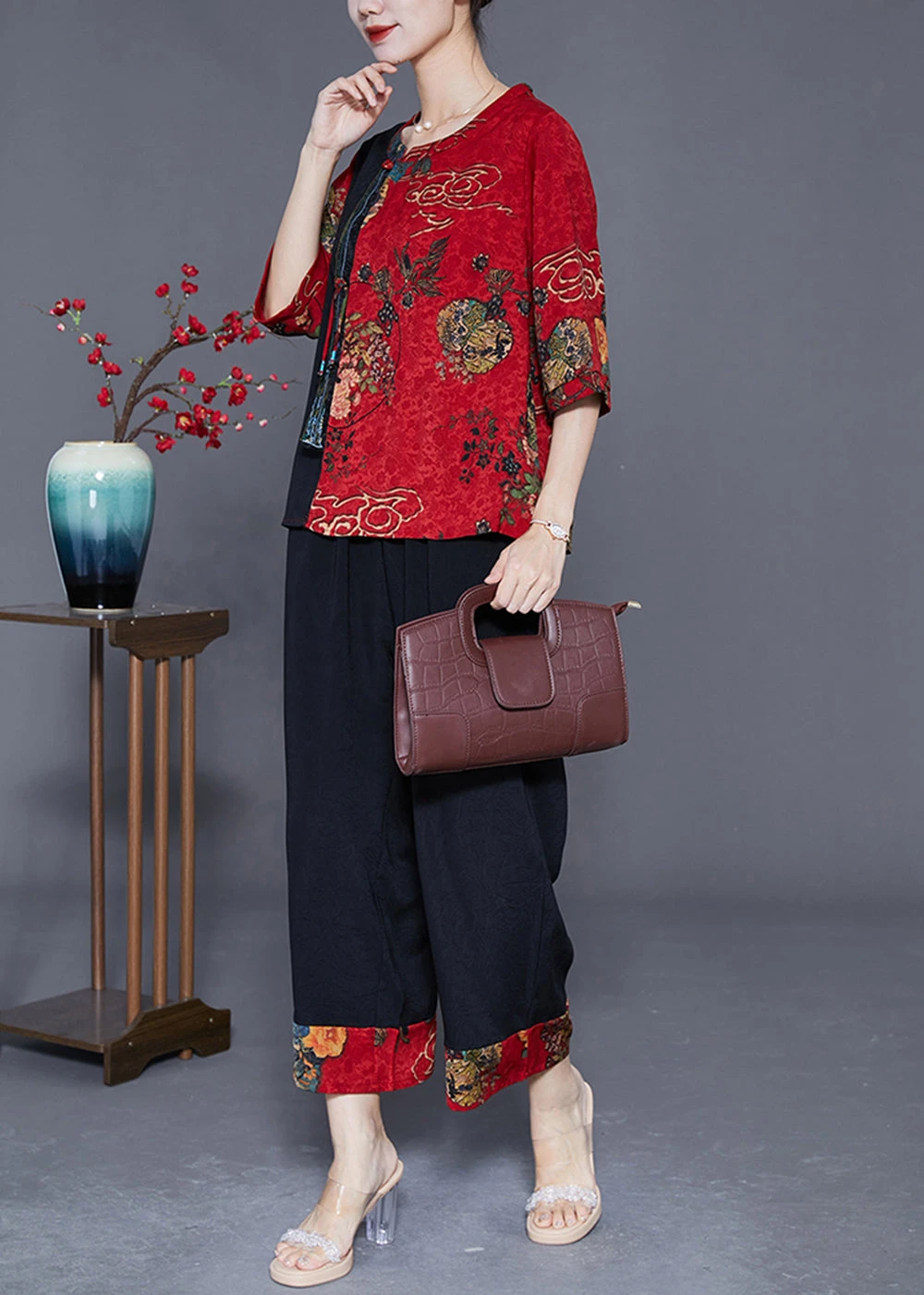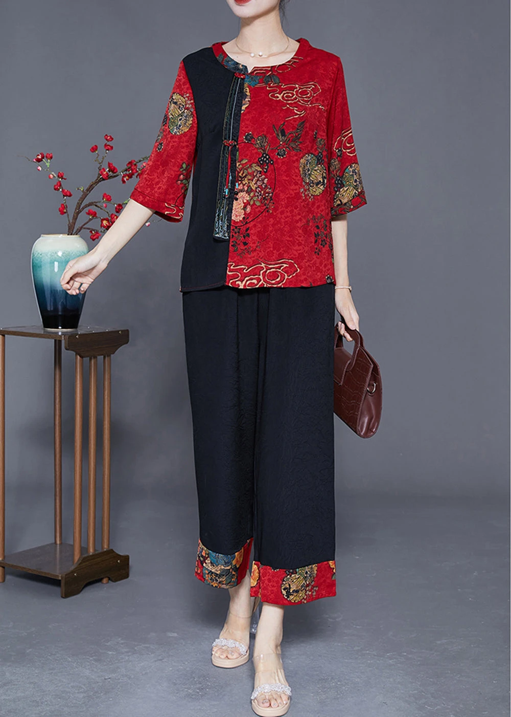 Women Red Print Patchwork Slim Fit Silk Two Piece Set Outfits Half Sleeve LY3629