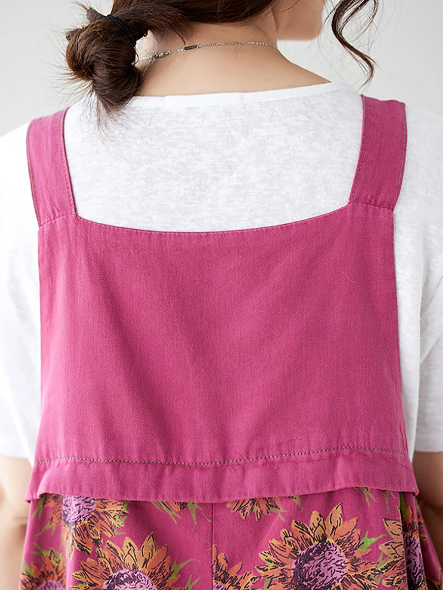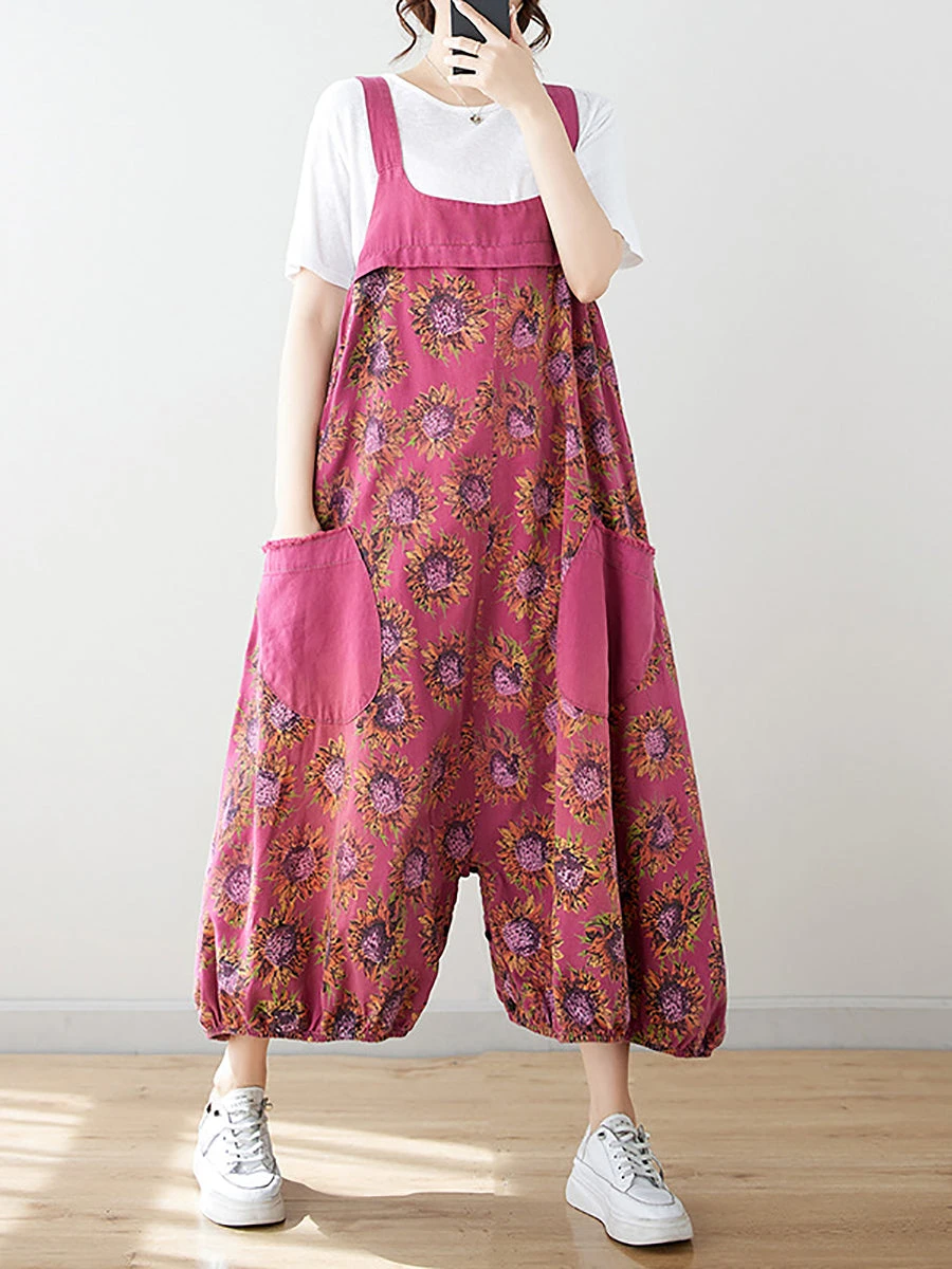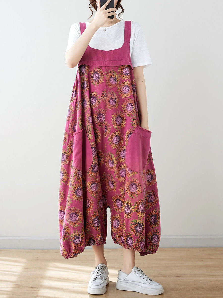 Indulge in the luxurious aesthetic of our Women Summer Artsy Floral Spliced Loose Jumpsuits AS1051, featuring a delicate floral pattern spliced onto 100% cotton material. Perfect for the warmer seasons, these jumpsuits boast convenient pockets and classic summary closures. With a standard thickness and flattering high waistline, these versatile ankle-length pants can be worn in both spring and summer.