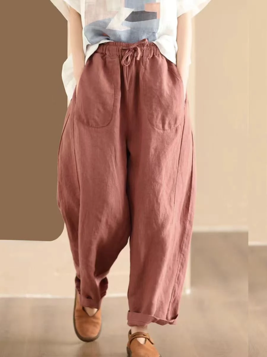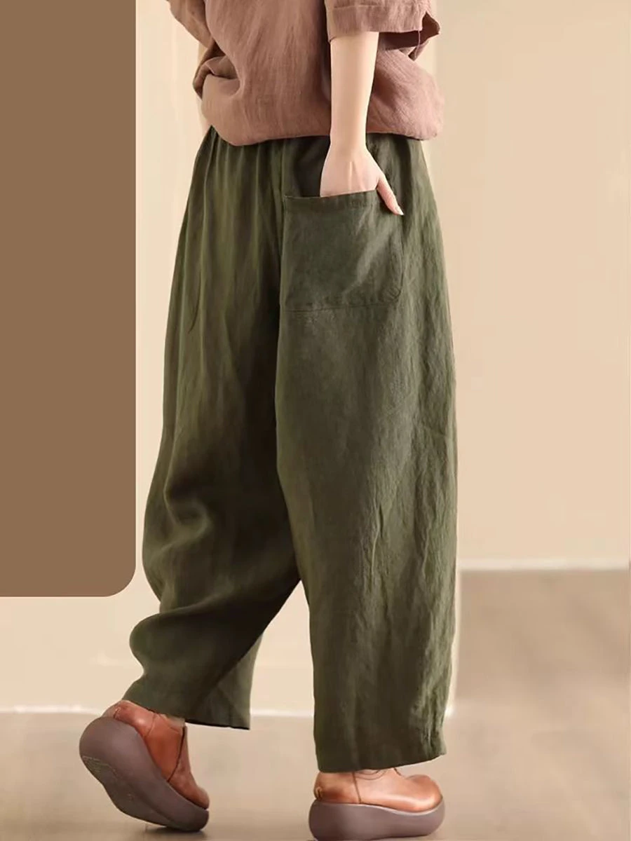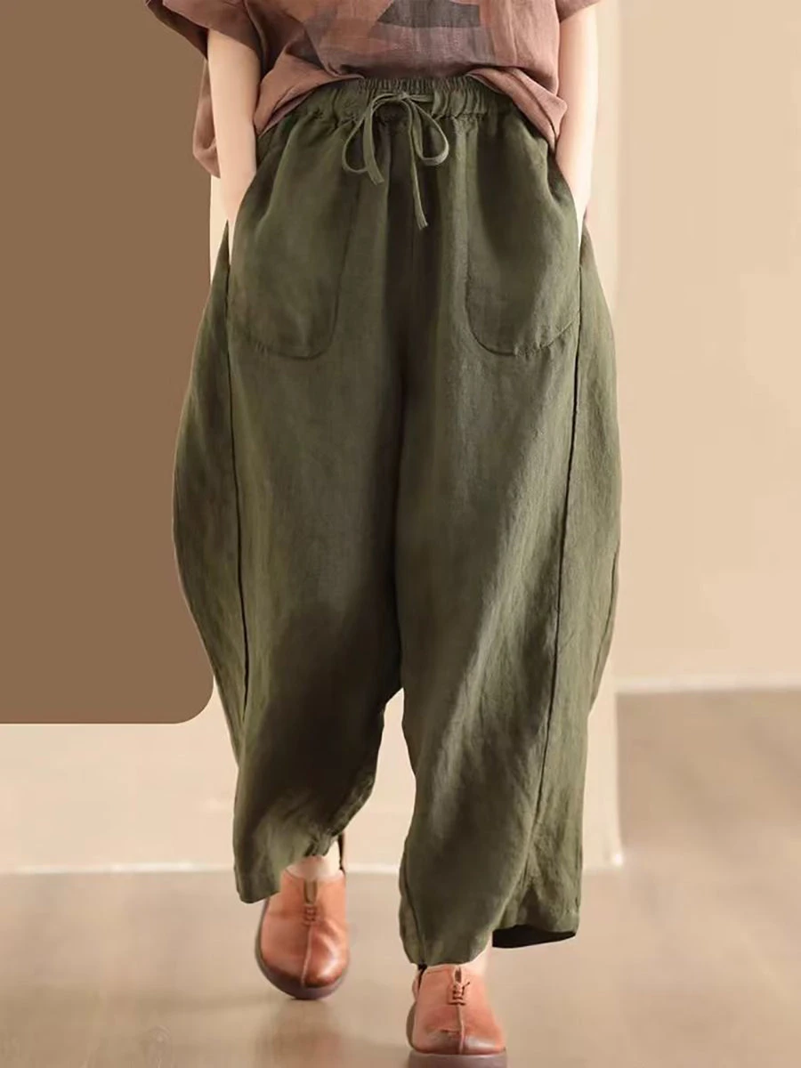 Constructed using premium linen material, these harem pants have a timeless and nostalgic style, complete with an elastic waist and a solid print. Their length, reaching the ankle, makes them ideal for warm weather wear in the spring and summer seasons.