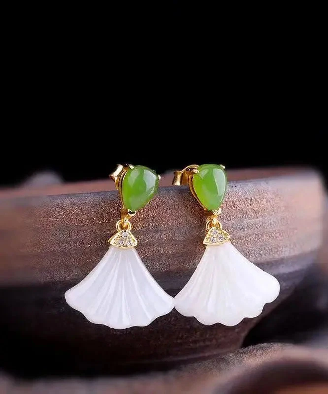 Women White Sterling Silver Inlaid Jade Fan Shaped Drop Earrings