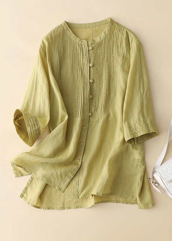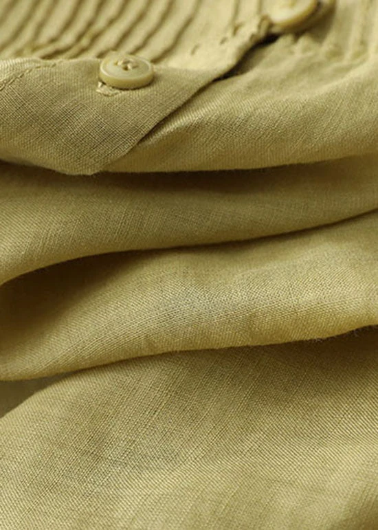 Yellow Patchwork Linen Blouses Button Wrinkled Bracelet Sleeve